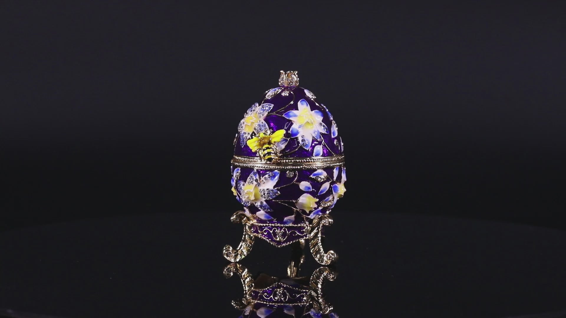 Indulge in extravagance with this exquisite egg adorned with a charming bee and delicate floral pattern in regal shades of purple. Crafted with precision, it stands at a captivating 3.75 inches and is adorned with luxurious Austrian crystals. Its sophistication is heightened by a hinged design with a 90-degree hinge, adorned with stunning blue flowers and inlayed Austrian crystals. Open it to discover a hidden compartment, perfect for storing precious jewelry and trinkets. A magnificent gift for collectors and flower lovers alike.
