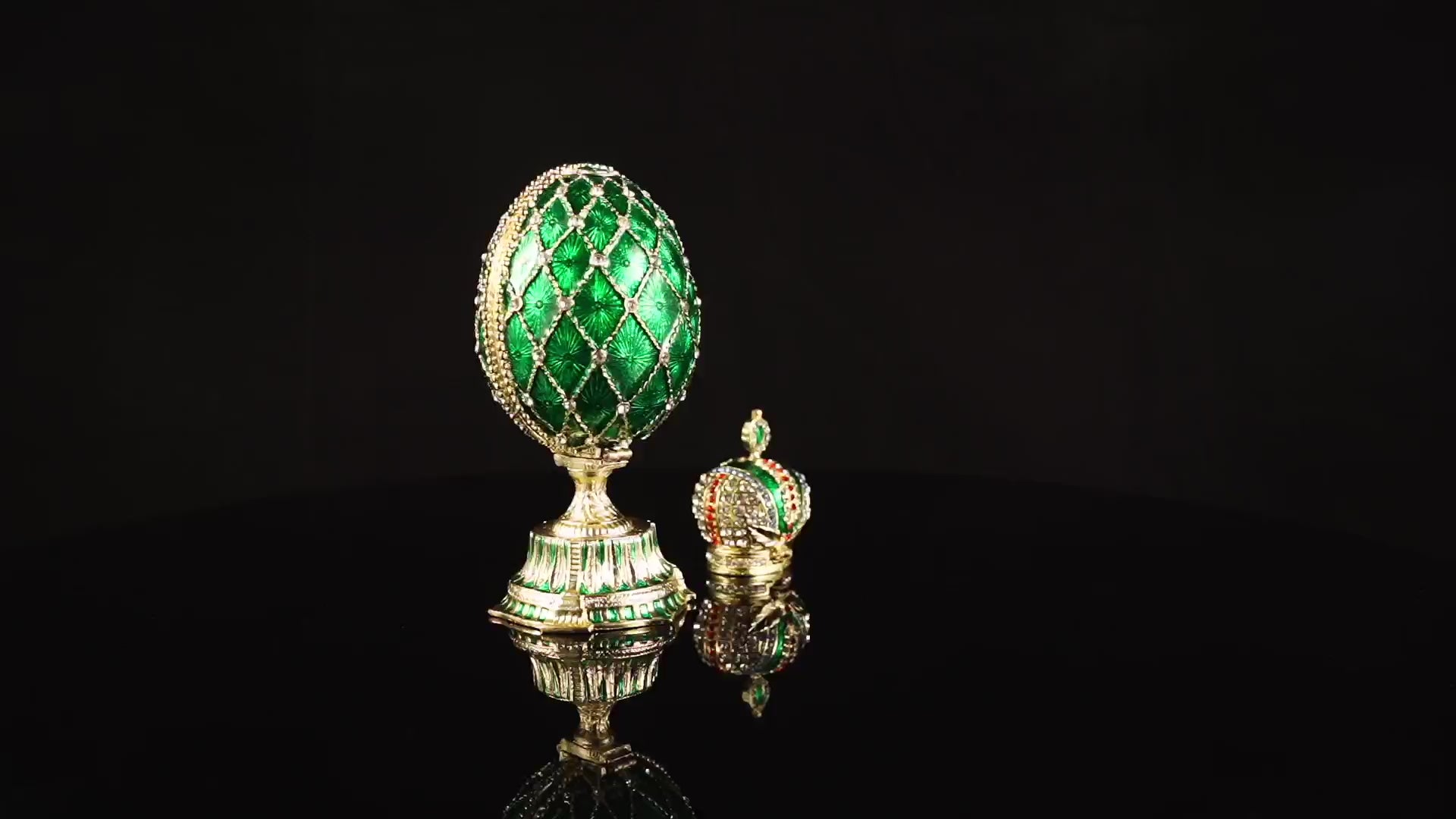 Discover the allure of our exquisite Green Egg Replica, adorned with a miniature crown encrusted with Swarovski crystals. This charming 1-inch crown sits atop a stunning 5-inch egg, creating a captivating addition to your collection. The delicate lace design is adorned with shimmering Austrian crystals, evoking a sense of opulence and luxury. Each piece is expertly crafted with gold lace, and the lace pattern on the exterior is a beautiful addition to the vibrant green hue. Please note that each egg replica may have a unique color on the inside charm, adding to its exclusive charm. With items currently in stock, don't hesitate to contact us with any inquiries. Size: 2.4*2.0*4.8 inches.